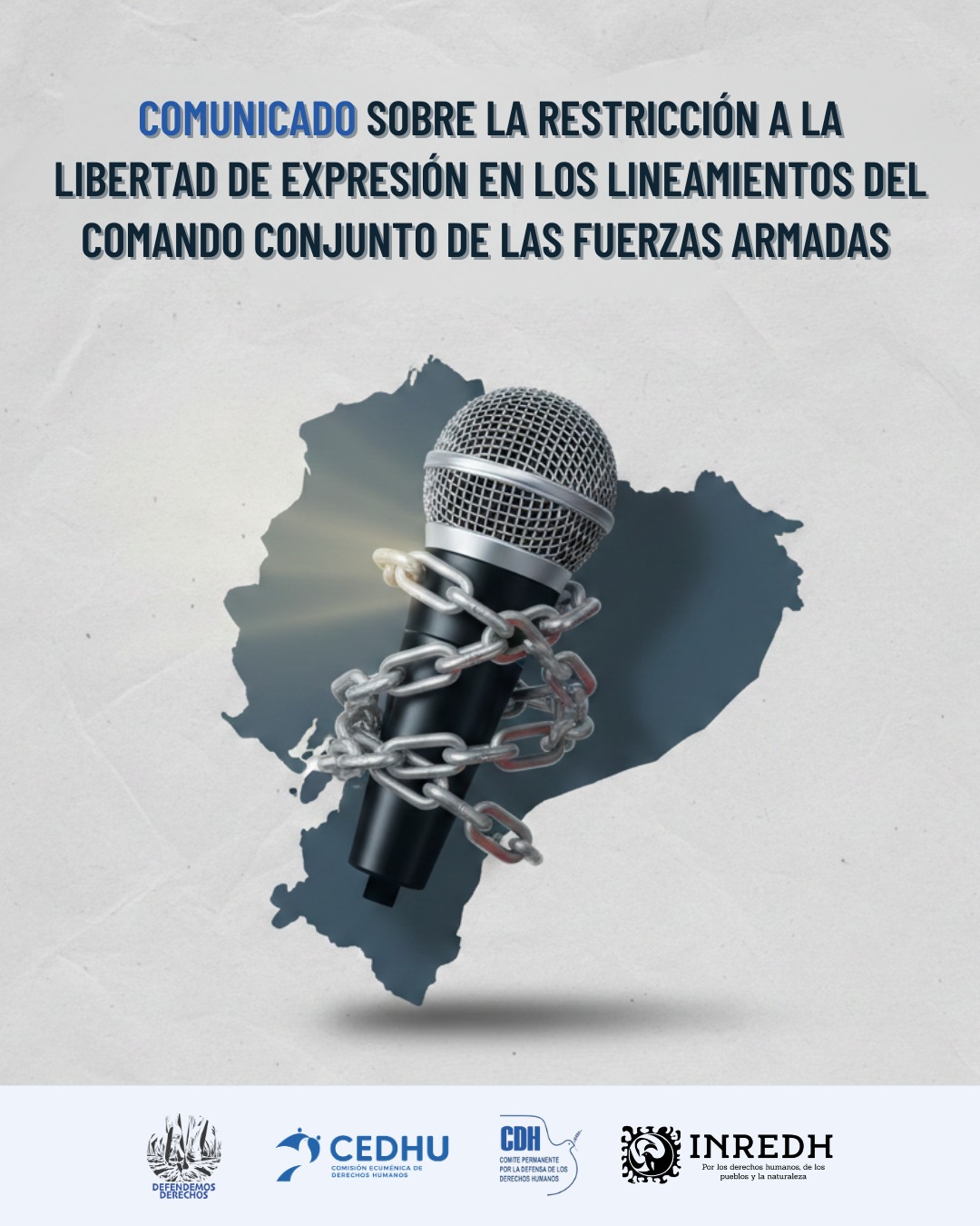 Desde INREDH, CEDHU Y CDH GYE rechazamos los nuevos lineamientos emitidos por el Comando Conjunto de las Fuerzas Armadas, por constituir una medida que configura mecanismos de censura previa y restringe de manera indebida el ejercicio de la libertad de expresión y el acceso a la información pública. Estas disposiciones afectan gravemente los estándares democráticos y vulneran el derecho de la ciudadanía a recibir información de interés público, especialmente en contextos donde la transparencia y el control social sobre las actuaciones estatales resultan fundamentales para la garantía de los derechos humanos.
